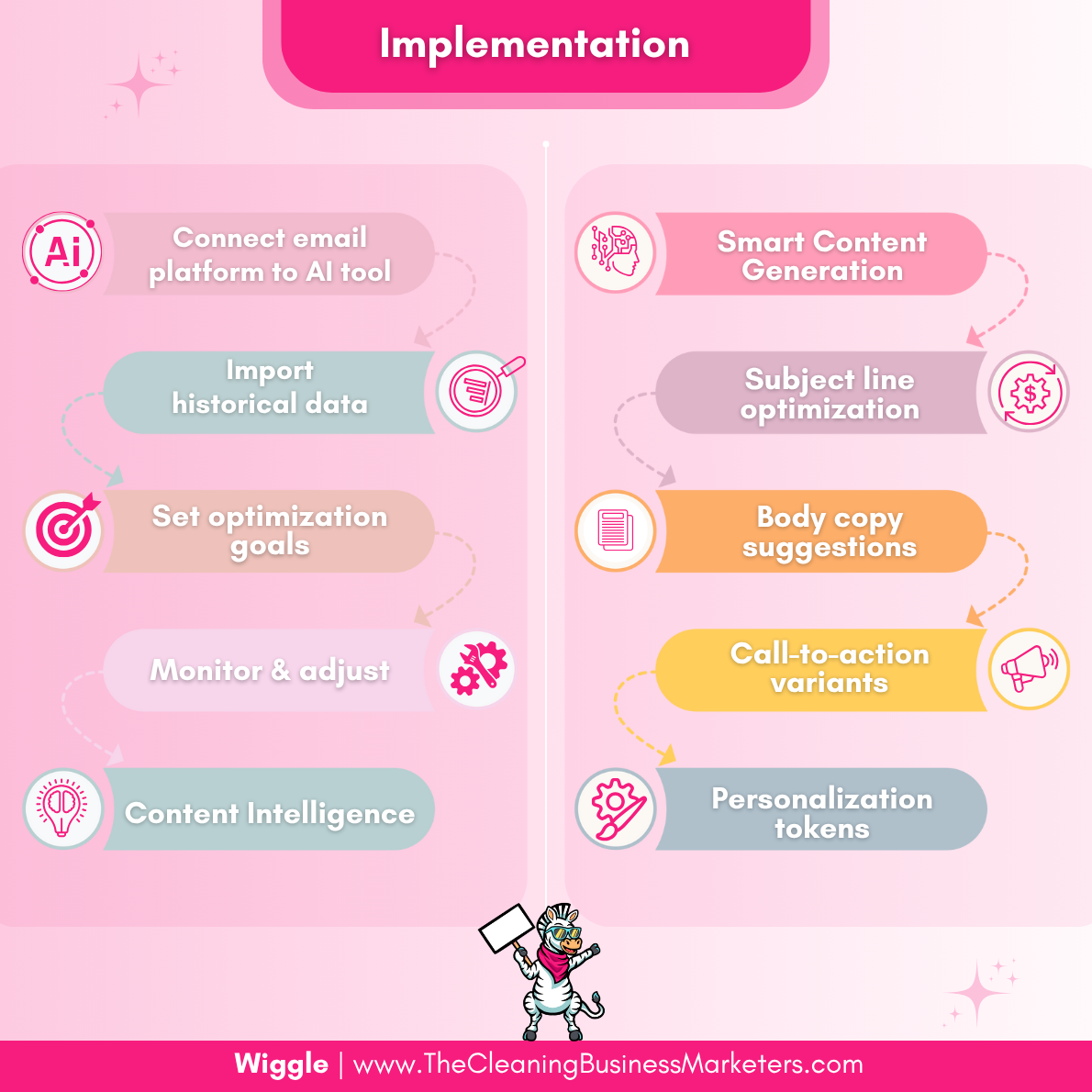 ๐ Implementation โข Connect your email platform to an AI tool, import your past data, set goals, and monitor results.