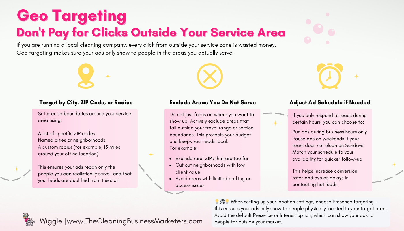 If you are running a local cleaning company, every click from outside your service zone is wasted money. Geo targeting makes sure your ads only show to people in the areas you actually serve.