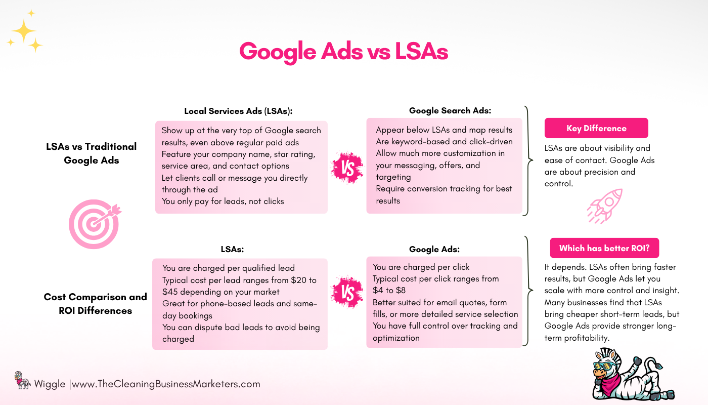 💡🦓 💡 If your cleaning company is ready to scale, use LSAs for quick wins and Google Ads for long-term growth. Monitor both closely and shift budget based on which one brings the best clients, not just the most leads.